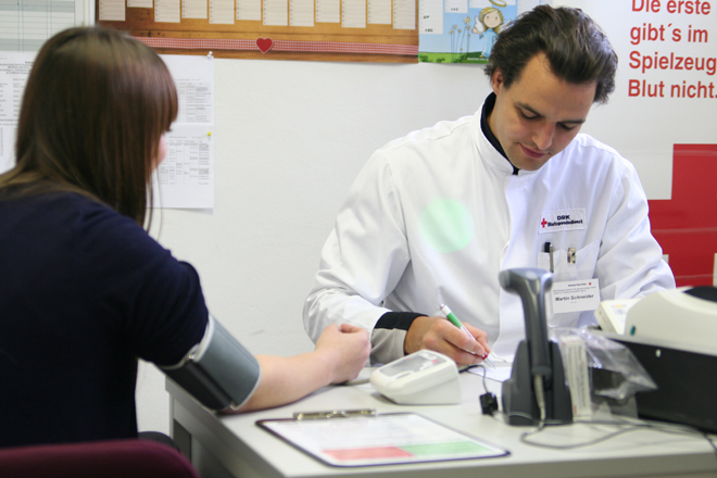 Danach werden die Körpertemperatur (im Ohr) und der Blutfarbstoffgehalt (Hämoglobinwert) festgestellt. Ein winziges Tröpfchen aus der Fingerkuppe oder dem Ohrläppchen reicht dafür aus. Blutdruck und Puls werden gemessen und alle Werte werden dokumentiert. Diese Daten geben zusammen mit dem ausgefüllten Anamnese-Fragebogen dem Arzt wertvolle Hinweise für seine Entscheidung über die Zulassung zur Blutspende.